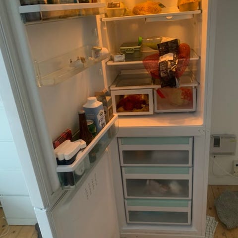 Køle-fryseskab i hvidt design som virker dog skal døres skubbes lidt i. Skabet har kølerum øverst og fryseskuffer nederst med piktogrammer for opbevaring. Indvendigt er der hylder og dørhylder til opbevaring af madvarer samt indvendig belysning. Velegnet til almindelig husholdningsbrug. Mærke og model er ikke oplyst.