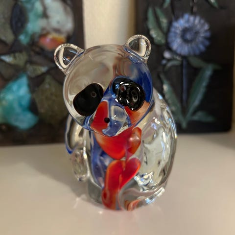 Glas figur formet som en svane med lang hals fra Bahne. Figuren har klar glasoverflade med orange farve i kroppen og blå farve på hovedet. Velegnet som dekoration i hjemmet, f.eks. på hylde, reol eller vindueskarm.