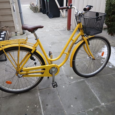 28" hjul, stel 51 cm, fodbremse og håndbremse, lås med nøgle, kurv, bagagebærer, ringeklokke og støtteben.
