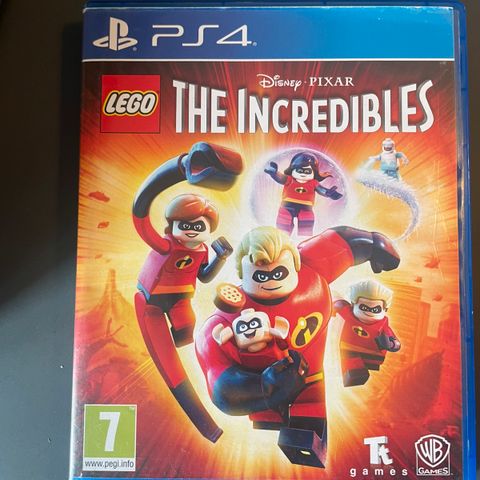 LEGO The Incredibles Playstation 4 spil. Fysisk spil på disk til PS4-konsol. Forsiden viser PEGI 7 aldersmærkning. Spillet er baseret på The Incredibles-universet i LEGO-stil og kan spilles på kompatible Playstation 4 systemer.
