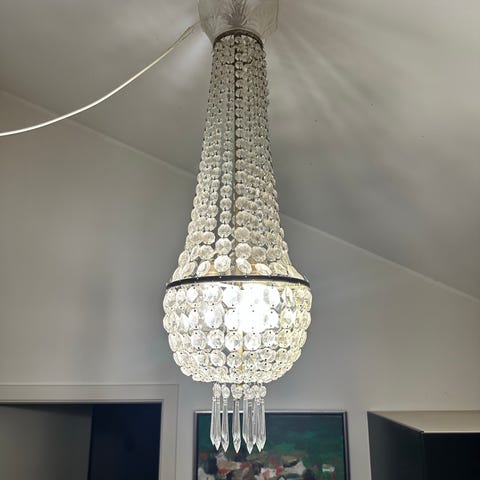 Antik lysekrone. Fungerer som den skal. Målene er: ca. 95 cm lang og 40 cm i bredden i bunden. Sælges som beset.