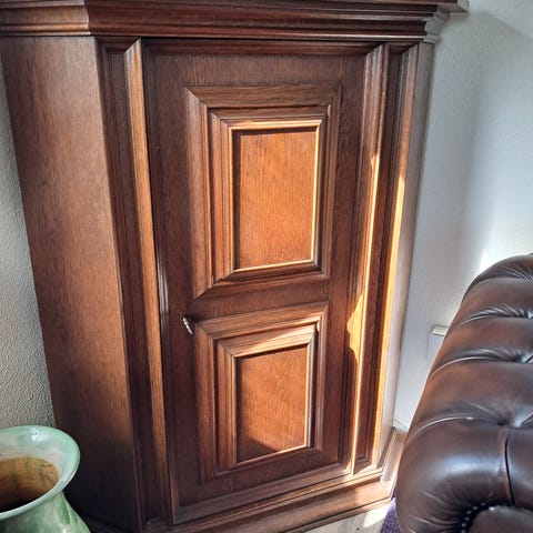 Hjørneskab i eg med med udskæringer fra H.C. Andersens Tommelise og Fyrtøjet.