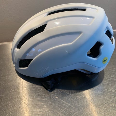 Sweet Protection Trailblazer cykelhjelm i hvid. Hjelmen har integreret skygge og store ventilationsåbninger for luftgennemstrømning. Justerbart spændesystem i nakken for bedre pasform. Velegnet til mountainbike og almindelig cykling. MIPS-logo på bagsiden indikerer rotationsbeskyttelsessystem i hjelmen.