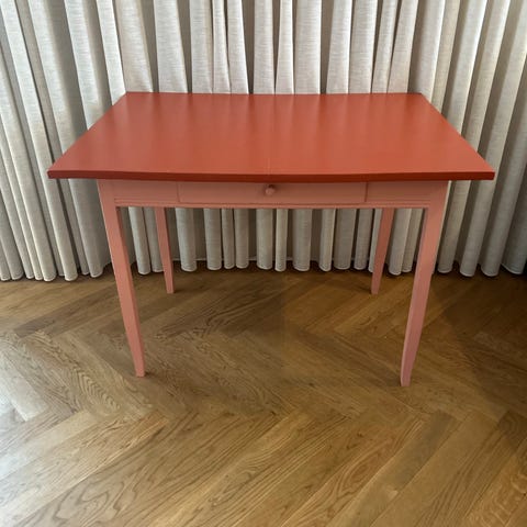 I flot lyseblå farve. Den er blevet slebet, og malet af maler. Bord og bænk hænger sammen. Flere billeder er tilføjet ☺️