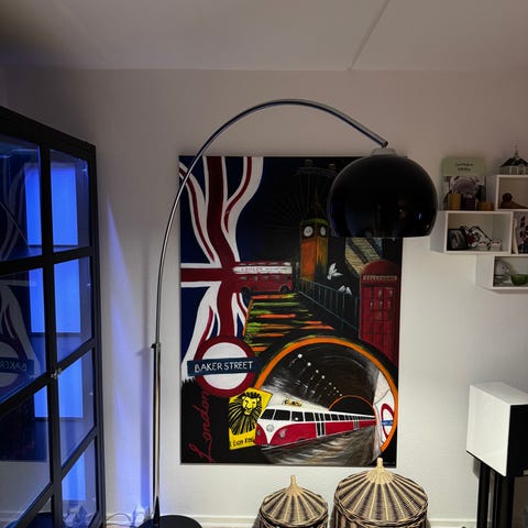 Elegant og morderne buelampe i klassisk Arco-design. Lampen har en flot buet stålarm og stor sort metalskræm, som giver et eksklusivt og stilrent udtryk.