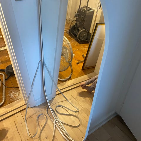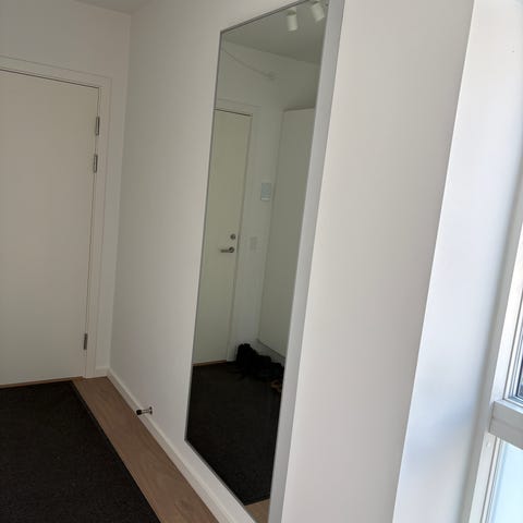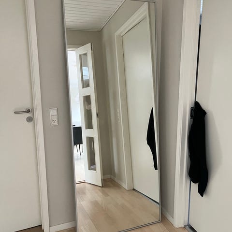 IKEA Hovet spejl. Rektangulær model med helkropsspejl, egnet til entre, soveværelse eller garderobe. Rammefarve er alu. Mål 196 h x 78 b x 6 d.Fremstår i fin stand uden skrammer. Nypris er 999 kr.