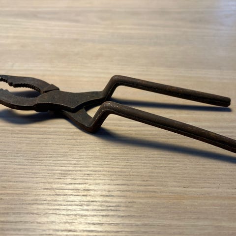 Knibtang m. 8 mm kæber i metal. Tangen har fjeder mellem håndtagene og en speciel kæbeform, der kan bruges til at gribe eller klippe mindre emner. Længden fremgår af billedet med tommestok. Velegnet som håndværktøj eller som ældre værktøj til samling eller dekoration.