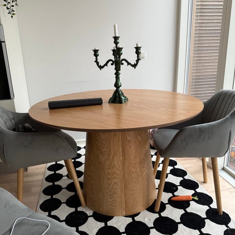 Rundt spisebord i træ med sorte metal ben sælges sammen med 4 stk. spisebordsstole. Bordet husker jeg ikke, hvor er fra. Stolene mener jeg er fra Jysk. Alt sammen i god stand. Skal afhentes tæt på Østerport Station.