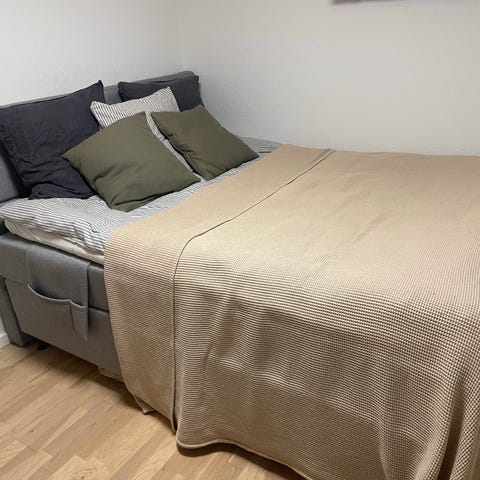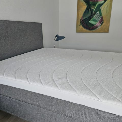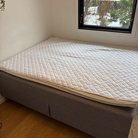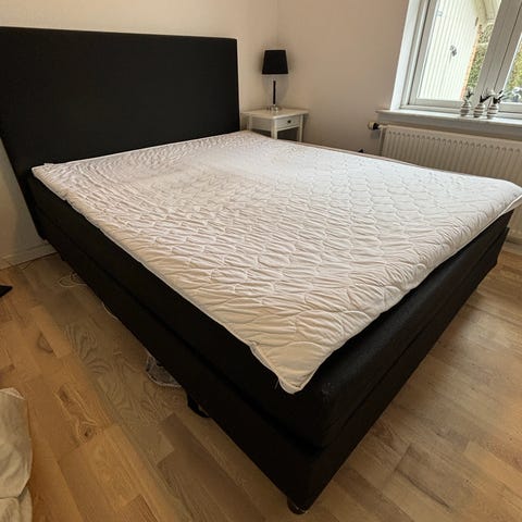 160x200 cm. Består af bundramme, fire madrasser og betræk med lynlås. Uden topmadras
