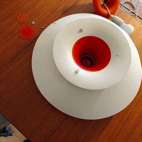 PH 5 pendel i hvidlakeret metal. Lampen er opbygget med flere skærme, som giver et blændfrit og nedadrettet lys, velegnet over spisebord eller arbejdsbord. Indersiden af skærmene har farvede detaljer, der bidrager til lysfordelingen. Pendlen tilsluttes loftudtag med ledning gennem toppen af lampen.