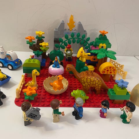 LEGO DUPLO Jurassic World legesæt med dinosaurer. Sættet indeholder flere DUPLO-figurer, dinosaurer i forskellige størrelser, klodser til at bygge en grotte og jungleomgivelser samt mindre tilbehørsdele som båd, æg og planteelementer. Store DUPLO-klodser er velegnede til mindre børn, der ønsker at bygge og lege med Jurassic World-temaet.