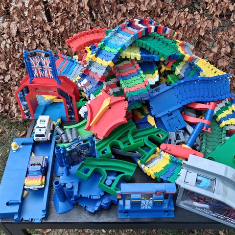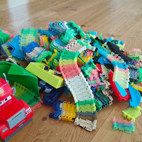 Flexi-trax bane med bil (Cars), automatisk vende station, flere ujævne terræn, broer, start position og masse ekstra bane