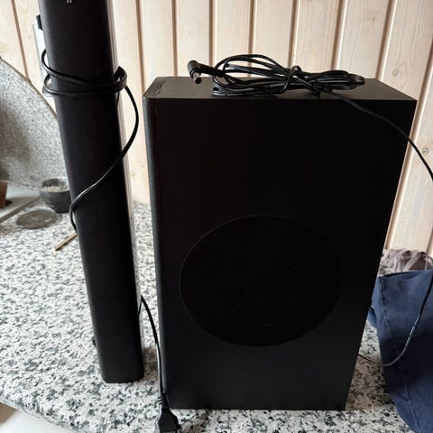 Der medfølger fjernbetjening, strømkabel og skruer, så du kan begynde at lytte med det samme.