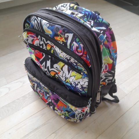 JEVA skoletaske i camouflage-mønster. Rygsækken har flere rum samt sidelomme i net til f.eks. drikkedunk.