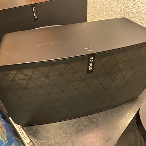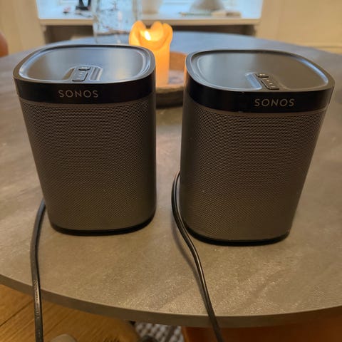 2 stk. Sonos Play:1 i sort med gulv stander og 1 stk Sonos soundbar med vægbeslag og kabel. Anlægget er ca. 10 år gammelt - men virker fantastisk. Der er kommet nogle hvide maler pletter bagpå og nederst på soundbar. Bemærk vil du styre volumen på soundbar fra TV fjernbetjening skal den virke med IR ellers kan man købe en eller bruge Sonos App.