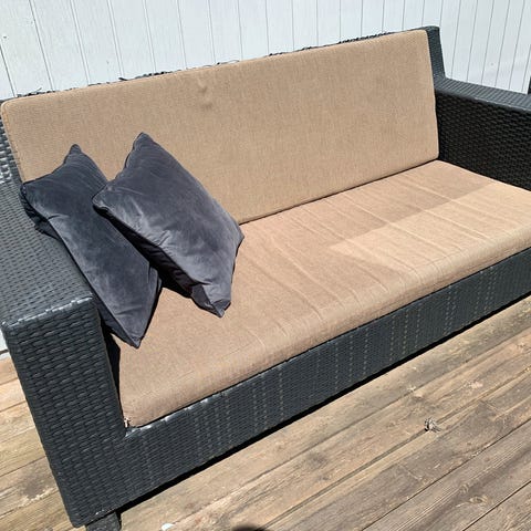 Have- eller loungesofa med grå hynder. Sofaen har ryghynder og sædehynde i matchende grå tekstil. Stel og ben er i træ, og siderne fremstår med flet- eller kurveinspireret design. Velegnet til brug på altan, terrasse eller i haven som siddeplads til flere personer.