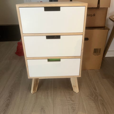 Fint lille sengebord / skab, sandsynligvis fra IKEA, har lidt småskrammer men fremstår ellers pænt.