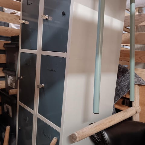 Skabet har ventilationshuller i top og bund samt hylde og bøjlestang i hvert rum.