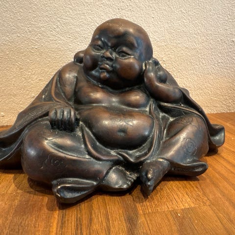 1 stk Lucky Buddha. Varm Messingfarvet Guld Glød. Mildt blidt udtryk (250,-)
