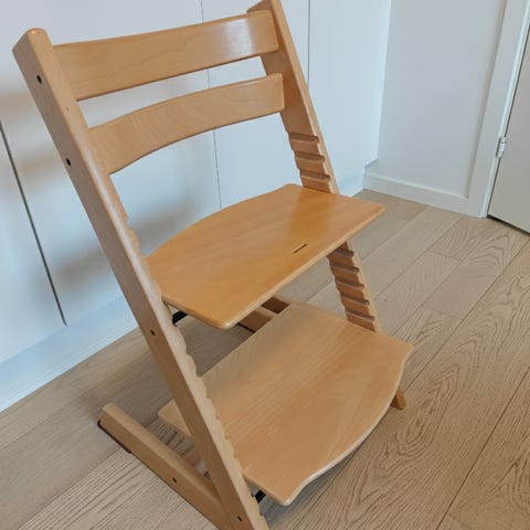 Stokke Tripp Trapp højstol i eg. Højstolen har justerbar siddeplade og fodplade, som kan tilpasses barnets højde. Modellen er udstyret med bøjle/selefront i mørk plast, som giver ekstra støtte til mindre børn. Egnet som spise- og siddeplads ved bordet for børn i forskellige aldre, efterhånden som stolen justeres. Klassisk Tripp Trapp-design, der kan bruges i mange år efter behov.