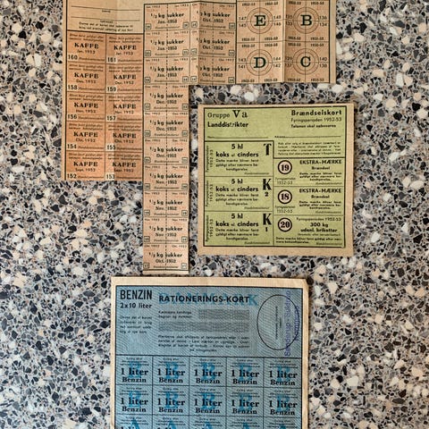 Meget fin samling med 5 hele store sammenhængende ark i god stand og en masse mindre, hvor der er klippet i. Til smør, kaffe, rugbrød osv. Sælges kun samlet. De mindste har desværre været bøjede og har ligget i en lille kuvert. Jeg har forsøgt at rette dem ud og lagt dem under noget tungt for at forhindre yderligere skade.