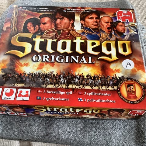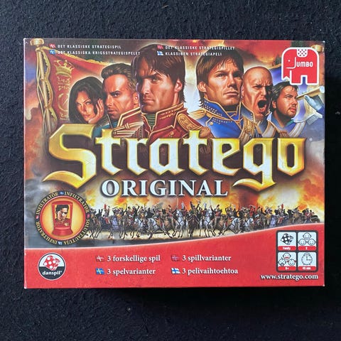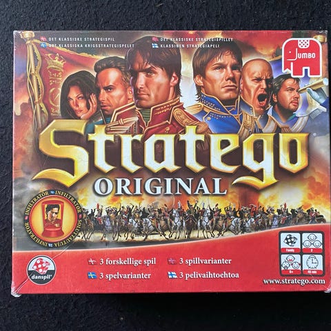 Stratego Original brætspil. Strategisk krigsspil for to spillere, hvor hver spiller opstiller en hær og forsøger at erobre modstanderens flag. Spillet indeholder spilleplade, spillebrikker med forskellige rangordener samt regler. Velegnet til familie- og strategispil for flere aldersgrupper afhængigt af anbefaling på æsken +8 år