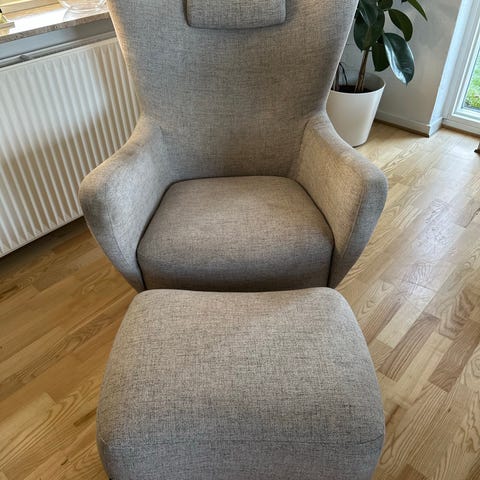 Ilva Elena lænestol med skammel og nakkestøtte. 3 år gammel Ikke brugt meget fremstår som ny. Koksgrå med træben. Kan afhentes på Frederiksberg. Nypris udsalg Ilva ca. 8.000,- sælges for 1.500,-