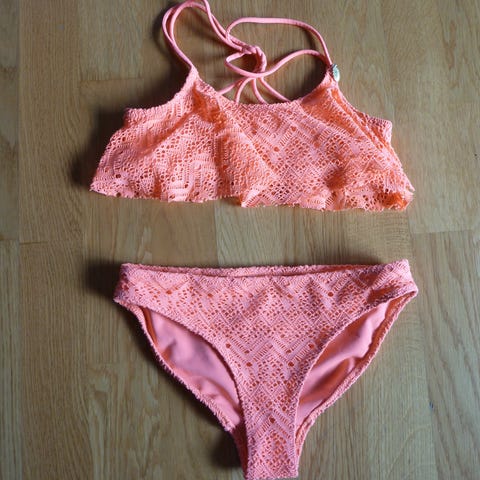 ONLY bikini til pige i str. 158. To-delt sæt med bikinitop med asymmetrisk én-skulder strop og matchende bikinitrusse. Farven er blå med mønster. Materiale i polyamid med inderside i lys kontrastfarve. Velegnet som badetøj til strand og pool for børn i størrelse 158/164