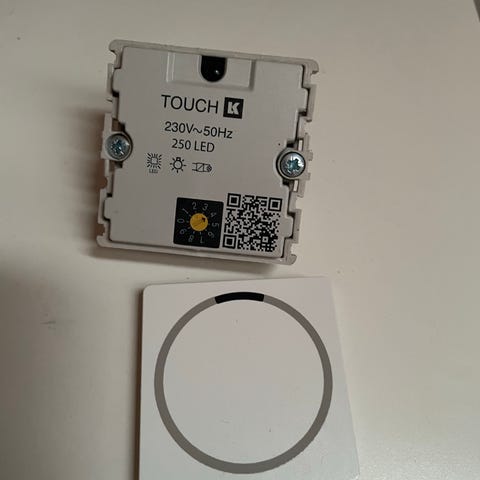 Touch K lysdæmper til indbygning i el-installation. Enheden er beregnet til 230V~ 50Hz og har en maksimal belastning på 350W LCR. Fronten er hvid med berøringsfelt i cirkelform. Velegnet til styring og dæmpning af kompatible lyskilder i bolig eller lignende installationer, hvor der ønskes trinløs regulering af lysstyrken.