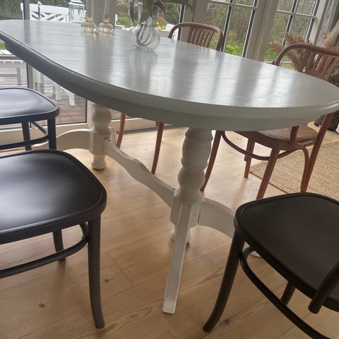 Det er robust, familiebrugt, og let at opfriske med ny maling. Estetisk flot bord til den kvalitetsbevidste.