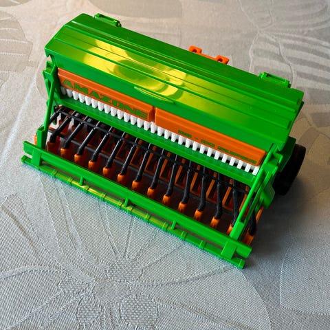 Bruder såmaskine i grøn plast med orange detaljer. Landbrugsredskab til leg med traktorer og andre landbrugskøretøjer i tilsvarende skala. Udstyret med trækhjul og anhængertræk, så det kan kobles bag på kompatible legetøjstraktorer. Velegnet til rolleleg med landbrugstema.