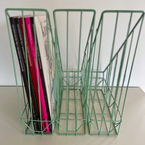 Avis- og magasinholder i gråt metal. Stativet har flere rum til opbevaring og fremvisning af aviser, blade eller bøger. Velegnet til brug i hjemmet, på kontor eller i venteområde til organiseret opbevaring af tryksager. 57 x 20 og 64 x 18 . Prisen er for en. Den til venstre er solgt
