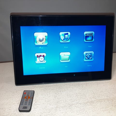 Denver PFF-1053W digital fotoramme med 10,1" (25,5 cm) skærm i hvid. (Modellen understøtter Frameo social photo frame-funktionen, så billeder kan modtages trådløst via wi-fi fra kompatible enheder med Frameo-app. Fotorammen er egnet til visning af digitale fotos i hjemmet eller på kontoret og kan placeres stående eller liggende efter behov.)