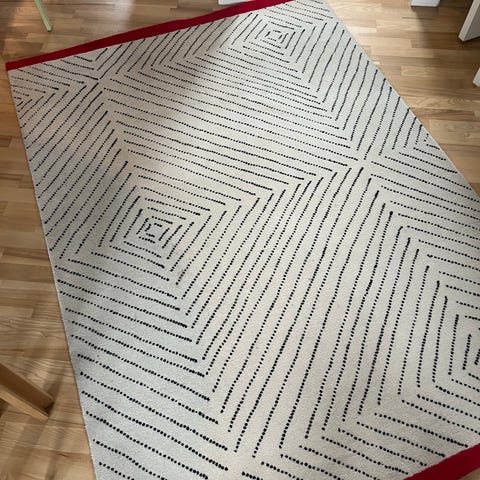 IKEA tæppe med grafisk, rektangulært mønster i sort og hvid med rød kant. Tæppet er vævet og egner sig til brug i stue, soveværelse eller andre opholdsrum. Købt oktober 2025.