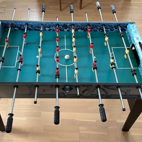 Bordfodbold bord til børn og voksne, med bolde, nypris 1499 kr., 118 cm lang, 61 cm bred, 79 cm høj., med brugsspor, dog fuldt funktionsdygtig.