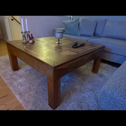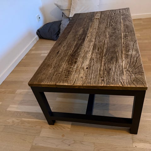 Solidt og rustikt sofabord. Skøn bordplade af genbrugstømmer der gør bordet unikt da ikke to er ens.