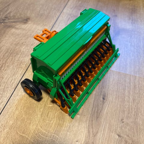 Bruder legetøjsplov i blå plast med sølvfarvede skær. Ploven er beregnet som tilbehør til legetøjstraktorer i tilsvarende skala og kan bruges til leg med landbrugstema. Velegnet til indendørs leg på gulv eller bord, hvor den kan forestille markarbejde og pløjning sammen med andre landbrugsmaskiner.