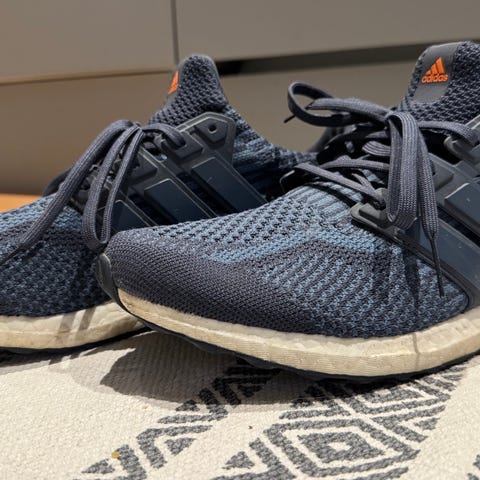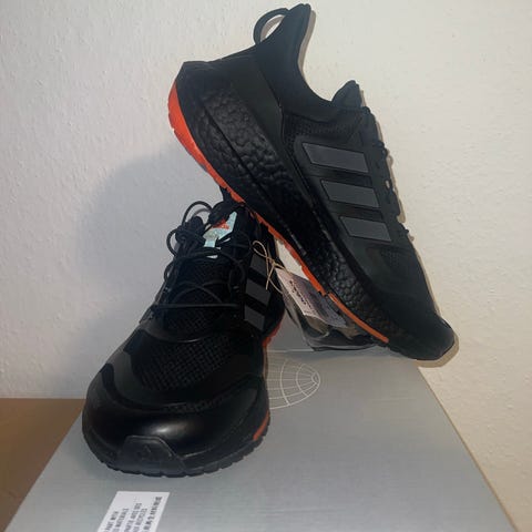 Adidas Ultraboost 21 med sort stof og sort sål. Str. 46⅔, men passer en str. 46 perfekt. Egentlig en løbesko, men jeg har brugt dem som sneakers. De er geniale til at gå rundt i byen eller til en længere gåtur. Sælges pga. udskiftning i garderoben. De har lidt brugsspor, men fejler absolut intet. Nypris ca. 1.000 kr.