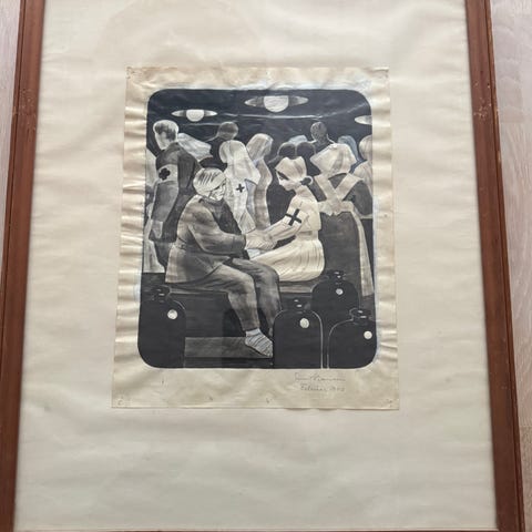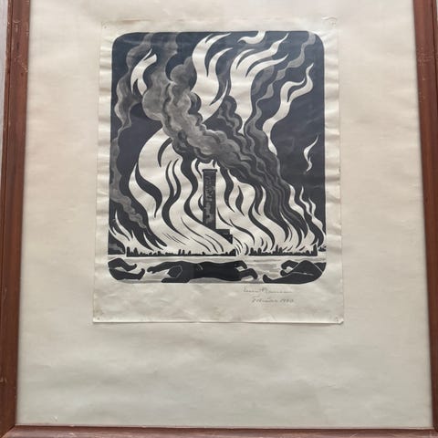 Smukt litografisk arbejde med original signatur af Ernst Hansen og dateret februar 1940. Motiv af en kirke eller katedral med kuppel og kors, omgivet af træer og en stor måne eller sol øverst i billedet. Trykket er udført i mørke nuancer på lys baggrund.