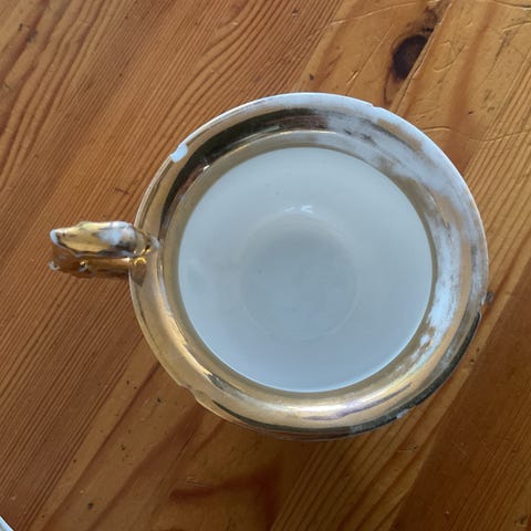 Kopperne har guldfarvet hank, og både kopper og underkopper er dekoreret med mønster langs kanten.