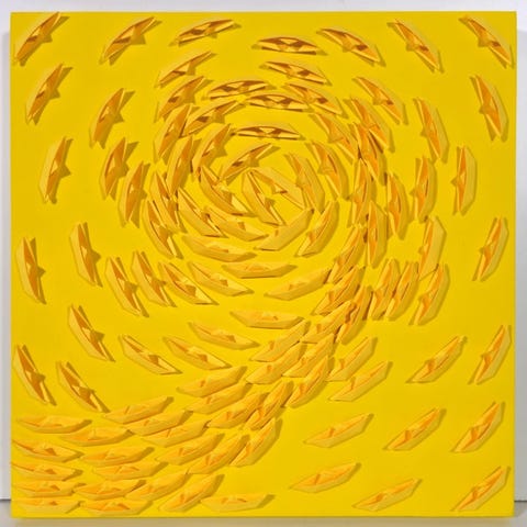 Gerda Hansberg (født 1948 i Mexico). Håndfremstillöede farver på håndfremstillet papir, "Mechanical Realm", sign. G. Hansberg 99, 37 x 29 cm. (Indrammet)