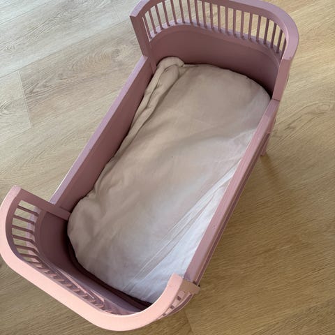 rigtig fin gul dukkeseng fra smallstuff med hjemmesyet dyne og pude