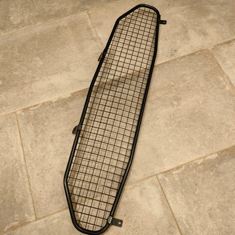 Travall hundegitter til bagagerum i mørke grå metal. Gitteret er udformet som et todelt bagagerumsgitter, der monteres bag bagsædet og adskiller bagagerum fra kabine. Hattehylden kan være monteret mens gitteret er installeret. Konstruktionen er i metal med netstruktur, som giver god udsigt bagud og samtidig holder hund eller bagage på plads. Egnet til montering i bilens bagagerum, hvor det fastgøres til karrosseri/bagsæde med de medfølgende beslag, som ses på billederne. Velegnet som fast afskærmning mellem passagerkabine og lastrum i stationcar. Gitteret kan sidde i forskellige positioner så pladsen kan begrænses efter hundens størrelse.