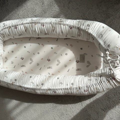 Vugge i træ med stofsider. Vuggen har et let stativ i lyst træ og ovale former. Siderne er udført i tekstilnet, som giver mulighed for luftcirkulation og indkig til barnet. Egnet til spædbørn, der har brug for en mindre soveplads i soveværelse eller stue. Kan anvendes med standard babydyne og pude efter behov. Velegnet som første seng til baby i hjemmet.