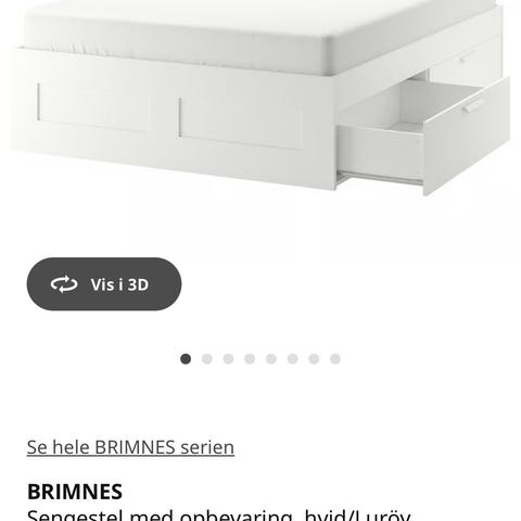 IKEA brimnes seng 180x200 med opbevaring i hvid. Sengen har integrerede skuffer/rum under liggefladen, som giver ekstra opbevaringsplads til f.eks. sengetøj, tøj eller andre genstande.