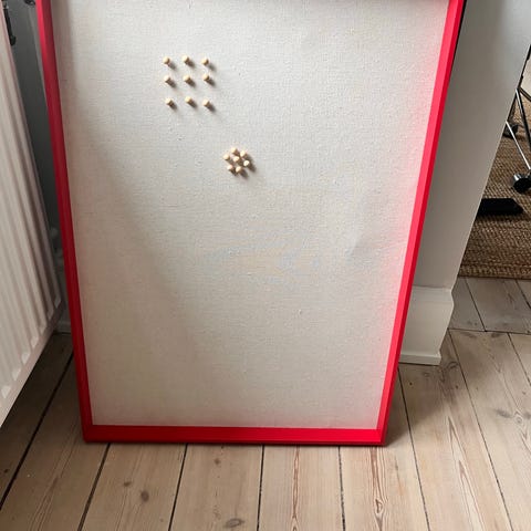 Håndlavet opslagstavle i blød træfiber beklædt med hør.