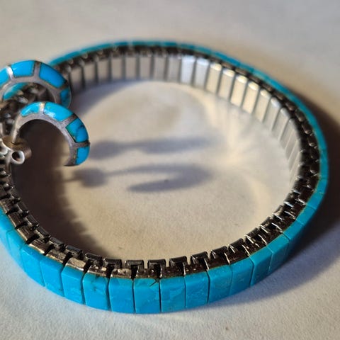Ørestikker, fingerring og hals vedhæng fra 1970'erne sælges samlet for 500,00 kr. Ringen og vedhæng er stemplet HS 925S, øreringene er uden stempler men kommer fra samme sæt.
