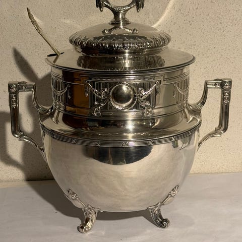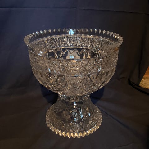 Ægte tysk krystal punch bowl med låg og tilhørende rundt fad i klar, slebet krystal. Beholderen er dekoreret med facetslebne mønstre og står på et matchende fad med tilsvarende slibninger. Formentlig fra første halvdel af 1900-tallet. Fad Ø 41 cm, bowl Ø 23 cm, højde 35/33,5 cm. Hele sættet består af ægte tysk 9,8 kg slebent krystalglas.