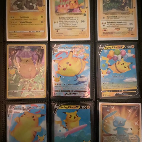 Pokémon samlekort med motiverne Pikachu, Zapdos og Mewtwo. Kortene er originale Pokémon Trading Card Game kort og opbevares i plastlommer. Velegnet til samling eller som supplement til eksisterende Pokémon kortsamling.