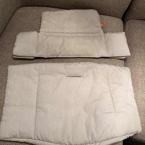 Stokke sæde- og ryghynde til højstol. Sættet består af en polstret sædehynde og en ryghynde i stribet multicolor mønster med nuancer af brun, orange, blå og hvid. Hynderne er beregnet til montering på en børnehøjstol for at give ekstra komfort og støtte til barnet. Velegnet som udskiftning eller ekstra sæt til en eksisterende Stokke højstol.